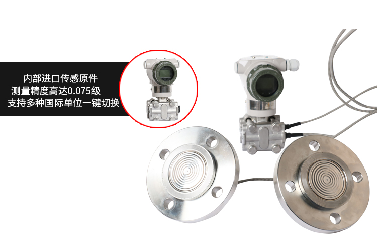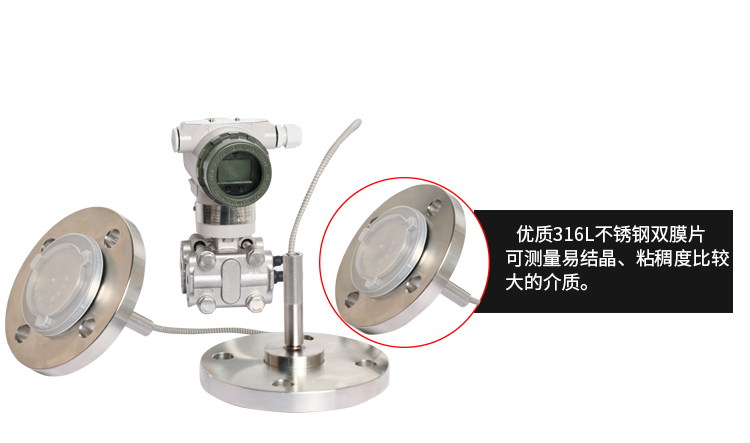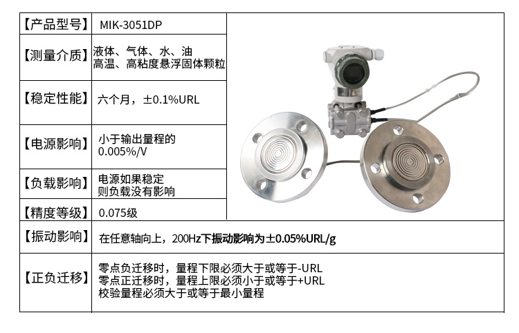 美控MIK-3051DP双法兰液位变送器产品利用差动电容检测原理,当两侧压力不一致时,致使容室中测量膜片产生位移,其位移量与压力差成正比,通过电路处理将电容变化量转换成4~20mA的二线制电流信号输送给二次仪表显示液位值,同时也可以表头显示液位值。该液位变送器具有坚固抗振、量程、零点和阻尼现场连续可调。 应用场合:液体、气体和蒸汽的液位检测。