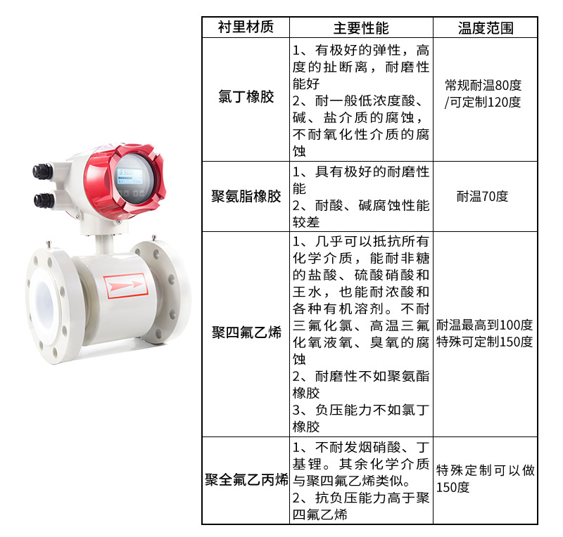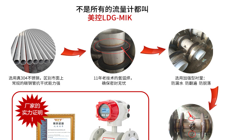 产品描述Product Description LDG-MIK升级款电磁流量计是根据法拉第电磁感应定律进行流量测试的流量计。电磁流量计的优点是压损极小,可测流量范围大。最大流量与最小流量的比值一般为10:1以上,适用的工业管径范围宽,最大可达3m,输出信号和被测流量呈线性,精确度较高,可测量电导率≥5μs/cm的酸、碱盐溶液、水、污水、腐蚀性液体以及泥浆、矿浆、纸浆等流体流量。 电磁流量计广泛应用于石油化工、钢铁冶金、给水排水、水利灌溉、水处理、污水处理站(环保污水控制、化工污水、电镀污水)、造纸(纸浆)、泥浆、医药、食品等工农业的生产公司过程流量测量和控制。