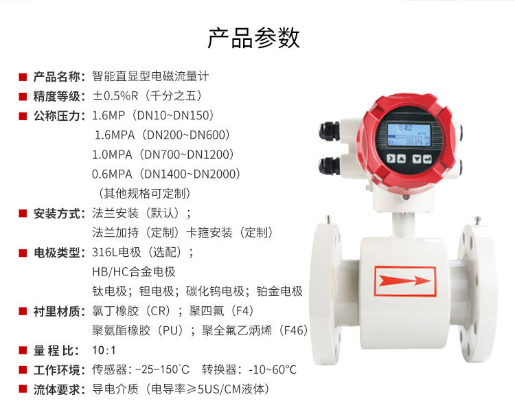 产品描述 Product Description 红外触摸式电磁流量计是根据法拉第电磁感应定律进行流量测试的流量计。电磁流量计的优点是压损极小,可测流量范围大。最大流量与最小流量的比值一般为10:1以上,适用的工业管径范围宽,最大可达3m,输出信号和被测流量呈线性,精确度较高,可测量电导率≥5μs/cm的酸、碱盐溶液、水、污水、腐蚀性液体以及泥浆、矿浆、纸浆等流体流量。 电磁流量计广泛应用于石油化工、钢铁冶金、给水排水、水利灌溉、水处理、污水处理站(环保污水控制、化工污水、电镀污水)、造纸(纸浆)、泥浆、医药、食品等工农业的生产公司过程流量测量和控制。