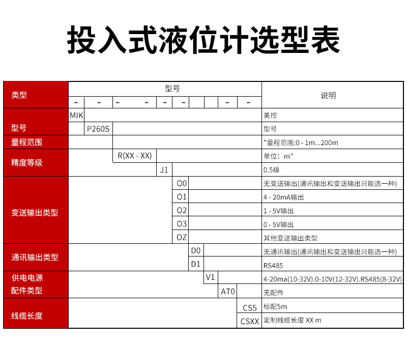 产品描述 Product Description 投入式液位变送器由高性能扩散硅压阻式压力传感器作为测量元件,将与液位深度成正比的液体静压压力准确测量出来,并经过信号调理电路转换成标准(电流或 电压)信号输出,建立起输出信号与液体深度的线性对应关系,实现对液体深度的测量。 本产品精度高、体积小, 直接投入液体中,即可测量出变送器末端到液面的液体 高度,使用方便。适用于石油、化工、 电厂、城市供水、 水文勘探领域的液位测量与控制。
