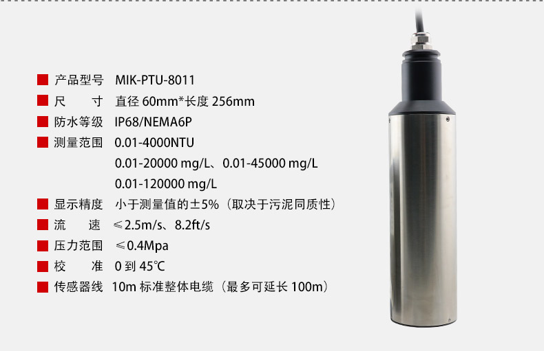 MIK-PTU100在线浊度分析仪内置微处理器,适用于于污水厂、自来水厂、水站、地表水、工业等领域浊度监测,例如:污水厂沉淀池、曝气池、氧化沟、提升泵站的浊度测量。本浊度/污泥浓度控制器是一款智能在线化学分析仪器,广泛应用于火电、化工化肥、冶金、环保、制药、生化、食品和自来水等各个行业。 MIK-PTU100浊度/污泥浓度传感器的原理基于组合红外吸收散射光线法,应用国际浊度测定标准ISO7027方法可以连续并精确地测定浊度或污泥浓度。